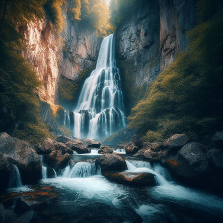Stunning waterfall flowing through a misty canyon surrounded by vibrant autumn foliage, creating a breathtaking natural landscape
