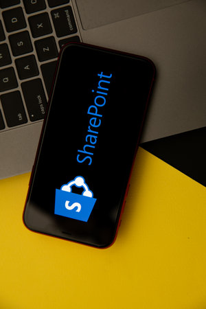 Tula, Russia - April 08, 2021: SharePoint logo on iPhone display