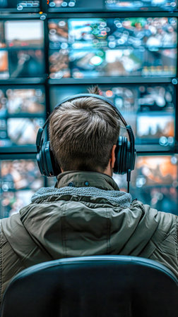 A man is sitting in front of a computer monitor with a headset on, security concept.