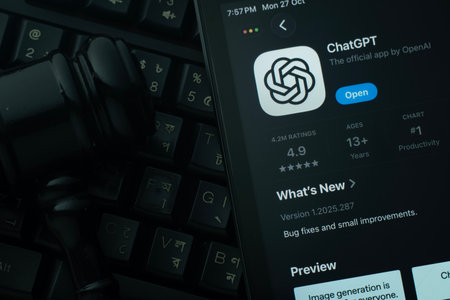 Dhaka, Bangladesh- 28 Oct 2025: An iPad displaying the ChatGPT app against a judge's gavel and dark keyboard background.