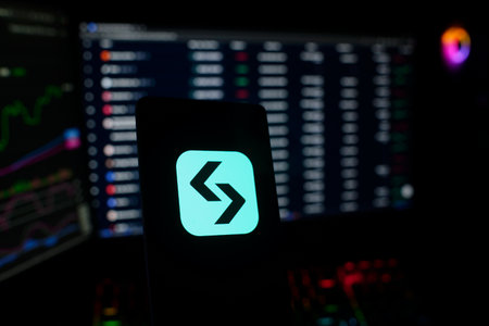 Dhaka, Bangladesh 26 September 2025:Visual of currency.com logo on phone against backdrop of trading screens and data
