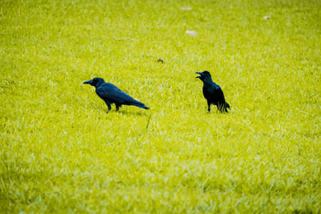 Black crowns walking on the green grass of lawn in the park. many crowns. Black Corvus birds sitting in grass.