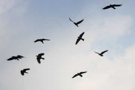 Flight of crows in the sky.