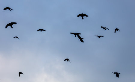 rooks flock flying through the sky,black birds, opened wing silhouettes