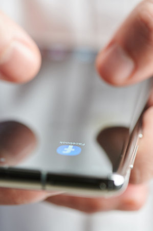 New york, USA - july 22, 2019: Starting facebook mobile app close up view in human hands