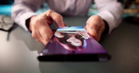 Tablet screen glowing as a hand swipes through a catalog of visuals, symbolizing modern digital interactions