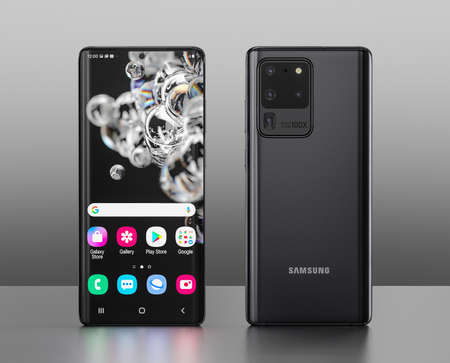 VERONA, ITALY - 01 MAY, 2020: Newly launched Samsung Galaxy S20 5G ultra smartphone is displayed for editorial purposes. 3d rendering