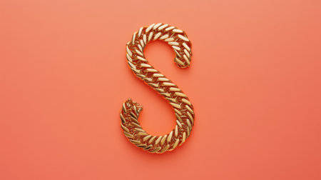 This stylish image showcases an elegant golden letter S crafted from a beautiful chain design, set against a vibrant coral background.