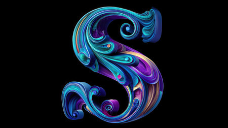 A stylized letter S is presented with flowing, ornamental designs, featuring a blend of blue, purple, and gold hues. The artwork showcases intricate details and a glossy appearance. The composition is set against a dark background, suggesting a digital artwork suitable for various decorative and design purposes.