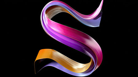 An abstract depiction showcases the letter S formed by flowing, colorful ribbons against a deep black backdrop. The artwork features a dynamic composition with glossy textures and a range of hues, including orange, purple, and pink. This vibrant design is suitable for various creative projects and visual communication.