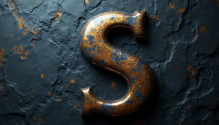 The image features a gleaming metallic letter S with a rich bronze finish, set against a rugged, dark textured background. The interplay of light and shadow highlights the letters curves, creating a striking visual contrast that evokes a sense of elegance and sophistication.