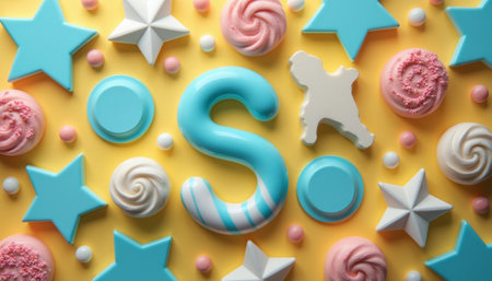 A vibrant assortment of sweets features a large blue S surrounded by pastel pink and white treats, including swirls, stars, and a gingerbread figure. This delightful composition evokes a sense of joy and whimsy, perfect for celebrations or childrens events.