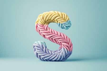 The letter S is made out of colorful yarn. The yarn is twisted and knotted to create a unique and playful design. The colors of the yarn are pink, blue, and yellow, which adds a fun