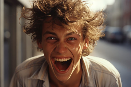 Portrait of a young man shouting in the street. Close up