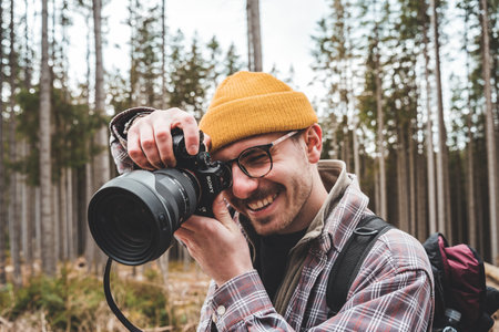 Professional male photographer shooting outdoor in autumn yellow forest on modern dslr camera. Empty area with copy space for text.