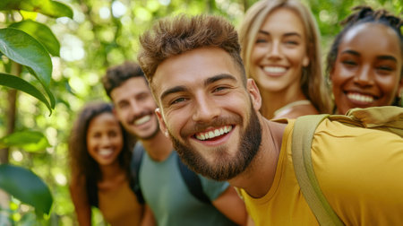 Group of friends enjoying a hike in a lush green forest, smiling brightly, AI