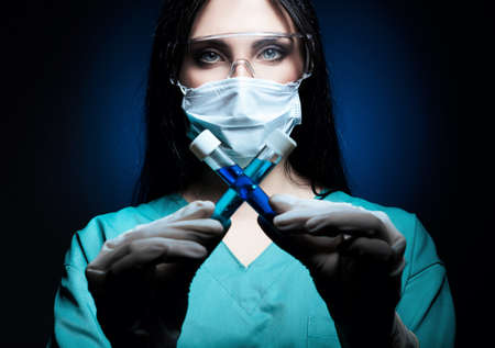 Color portrait of a young female medic arranging her gloves, wearing a mask and glasses, illustration for the coronavirus Covid-19 pandemic.