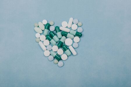 A hand with blue latex gloves grabbing hand full of medicines, Capsules for Vitamines,drugs,medication. Health,business concept