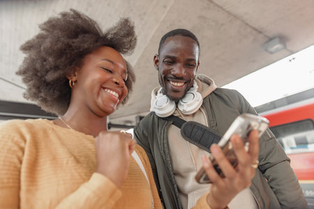 Smiling African American couple having fun using a smartphone while waiting for the train at the railway station platform.