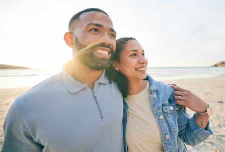 Sunrise, happy and couple hug by beach for bonding, quality time and love on holiday in nature. Morning, relationship and face of happy man and woman embrace on vacation, honeymoon and travel by sea