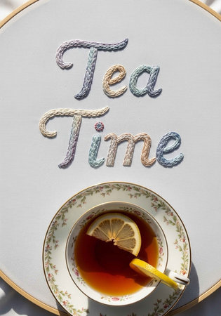 A cup of tea with lemon on a saucer and the words Tea Time embroidered above it