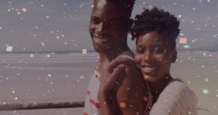 Hugging couple wearing casual outfits on railing overlooking beach and ocean, with confetti overlay. Romance, relaxation, seaside, happiness, serenity, connection, celebration