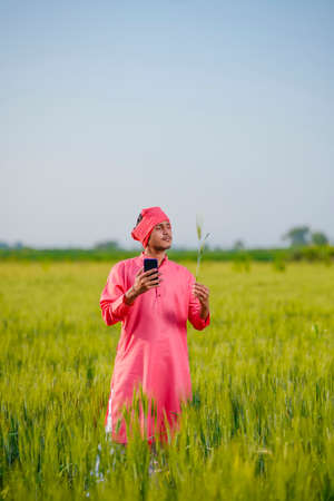 Young indian farmer at green wheat field