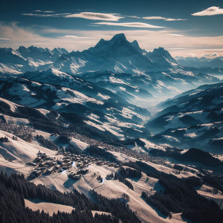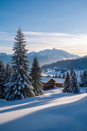 Peaceful winter scene of a small alpine village resting in a quiet snow-filled valley