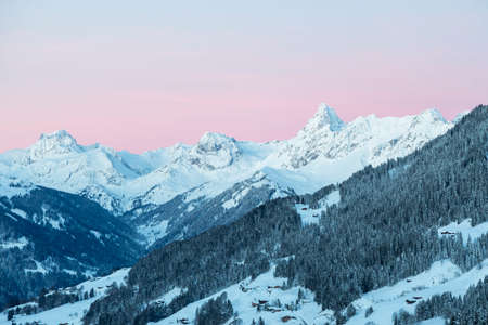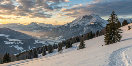 Tranquil winter alpine landscape with snowy mountains glowing in warm sunset light