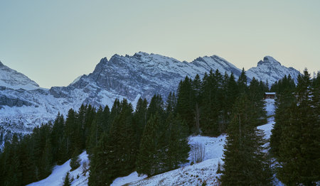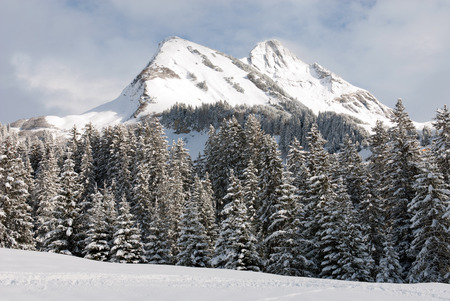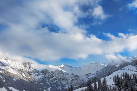 Beautiful winter landscape in the Swiss mountains. Panoramic view over the snow covered landscape.