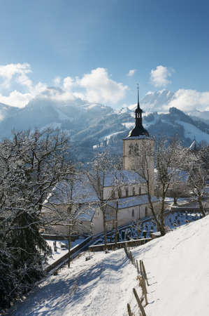 View of the church in Gruyere village on a sunny winter day, Switzerland