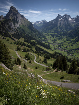 Springtime serenity sunny day in the alps, blooming meadows and majestic mountains