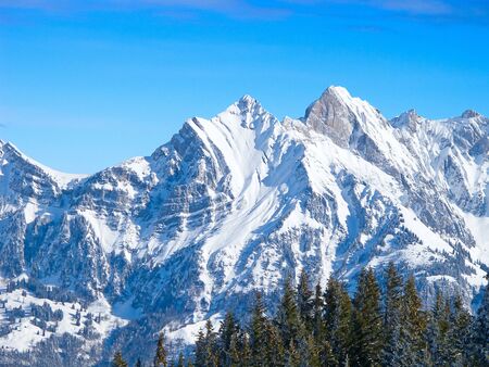 Snowy alpine mountain peaks on a sunny winter day, Switzerland