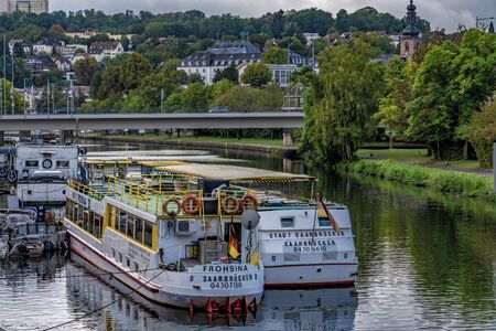 SAARBRUCKEN, GERMANY - SEPTEMBER 23: This is a scenic view of boats and nature along the River Saar on September 23, 2019 in Saarbrucken