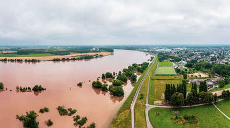 Flood on the river Rhine near Düsseldorf, Germany. Drone photography.
