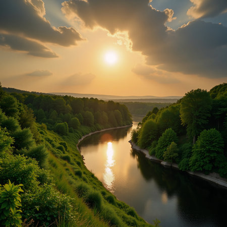 Experience the breathtaking beauty of a lush green river valley bathed in warm sunlight. This scenic image showcases a vibrant landscape where a flowing river carves its way through a dense forest of towering trees. An aerial view captures the expanse of the green valley, highlighting the natural beauty and serene atmosphere. Perfect for travel and travel destinations content, this panorama evokes a sense of tranquility and is ideal for illustrating concepts of nature, environment, and outdoors adventures.