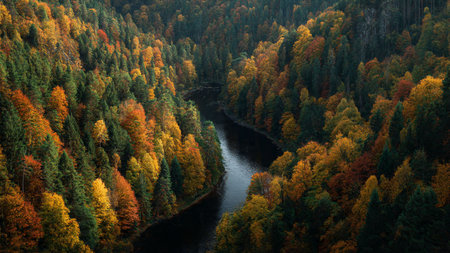 Scenic view of a winding river cutting through a dense forest with vibrant autumn foliage