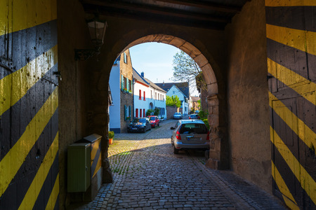 Bedburg, Germany - May 10, 2017: historic town gate in Bedburg-Kaster. Kaster is a district of Bedburg in the Rhein-Erft-Kreis. It is known for its well preserved historic townscape