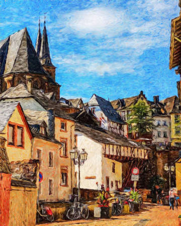 Colorful painting modern artistic artwork, real brush strokes, drawing in oil European famous old street view, beautiful old vintage houses, design print for canvas or paper poster, touristic product