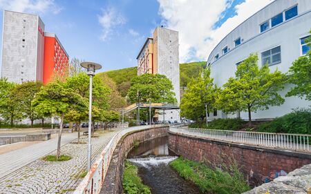 SUHL, GERMANY - CIRCA APRIL, 2019: Hasel river and townscape of Suhl in Thuringia, Germany