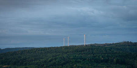 Wind turbines on a hill with forest with clouds in the sky
