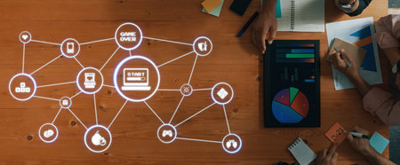Innovative SaaS Concept with Text Overlay and Data Visualization in a Modern Workspace Setting. Asymptotic smart data analytic.