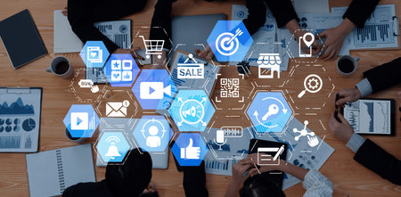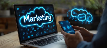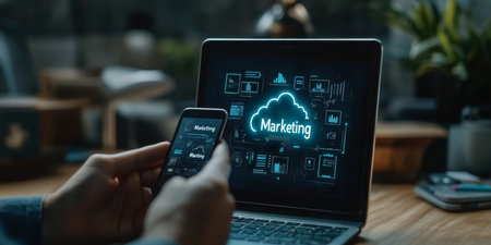 Business Professional Utilizing Cloud-Based Marketing Solutions via Laptop and Mobile Phone