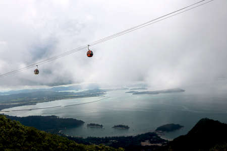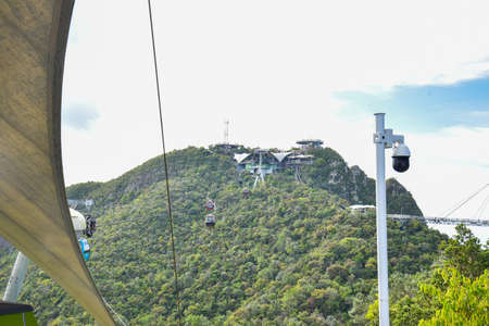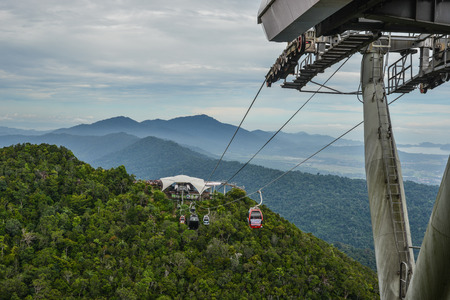 Cable car gondolas travel to and fro the Middle and Upper stations,against a beautiful backdrop of Lankawis countryside,coastline and tree covered mountain peaks,a major tourist destination.