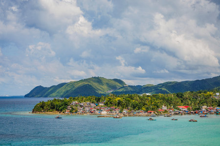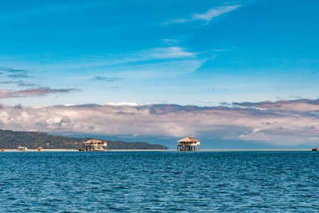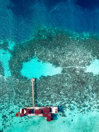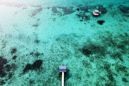 Aerial view of beautiful landscape near the island and sea gypsy water village with the water chalet stilt house during sunrise in Bum Bum island Semporna, Sabah, Malaysia.
