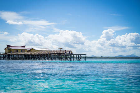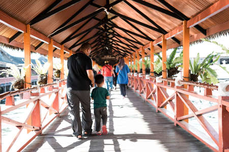 Semporna, Malaysia - November 28, 2019 : Jetty with people sitting under a sunny day, view from the boat.