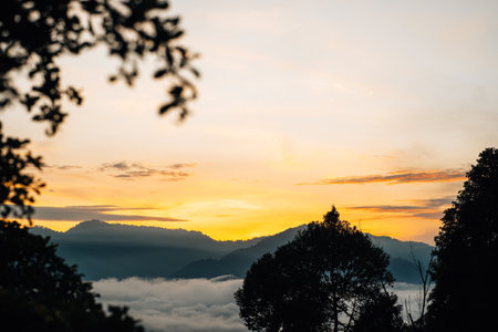Sea clouds during golden sunrise above the Titiwangsa range mountains in Lenggong, Perak.