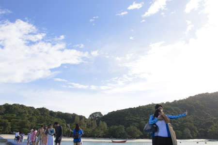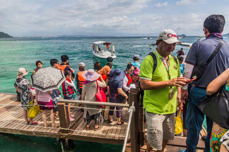 Phuket, Thailand - October 19, 2020 : Relax time, tourists walking on plastic pontoon walk way to the beach after docking by yacht. Koh Racha, Phuket city.