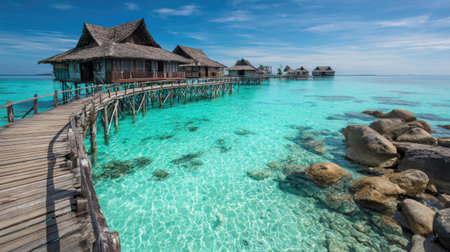 This stunning image captures idyllic overwater bungalows set against a backdrop of vibrant turquoise waters and a clear blue sky, perfect for a peaceful retreat.