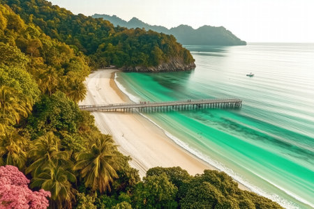 A breathtaking coastal scene where the emerald sea meets a white sandy beach, with a dense jungle backdrop and a single, quaint wooden pier stretching into the water